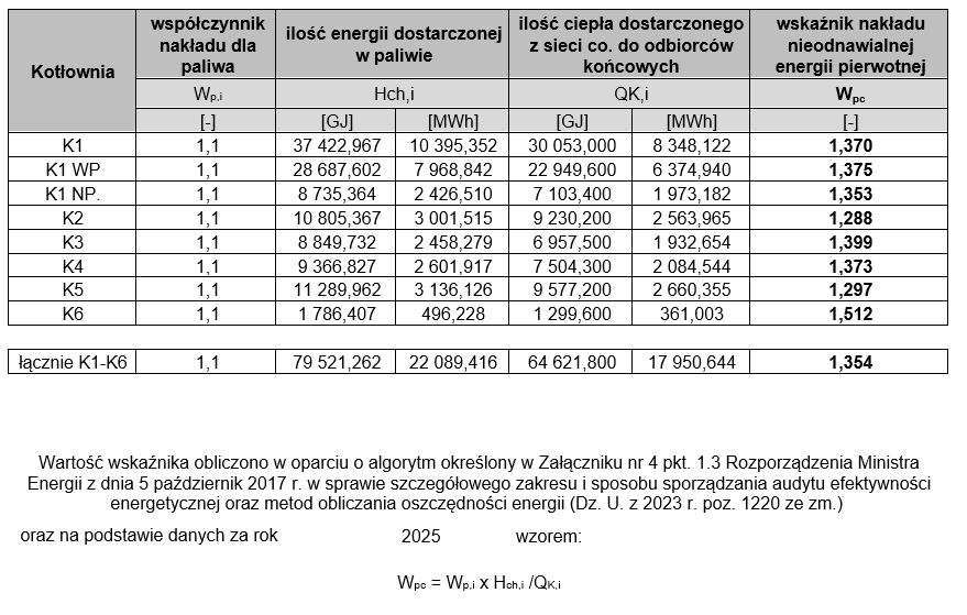 Przedsiębiorstwo Inżynierii Komunalnej Sp. z o. o.  informuje, że wartości wskaźników nakładu nieodwracalnej energii pierwotnej dla poszczególnych sieci ciepłowniczych, bez względu na ilość źródeł ciepła oraz technologii wykorzystanych do wytwarzania i dostarczania ciepła do odbiorcy końcowego wynoszą:
